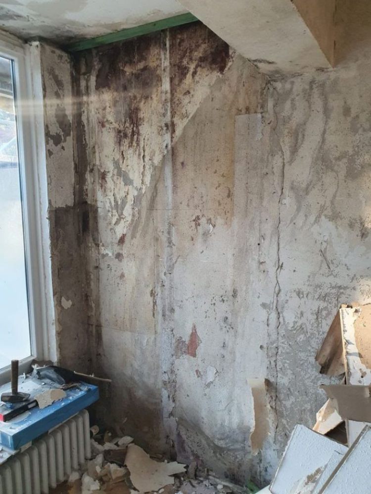 Bei längerfristig durchfeuchteten Putzflächen ist dieser i.d.R. vollständig zu entfernen, da das Pilzgeflecht (Mycel) in aller Regel bereits in die Putzstruktur eingedrungen ist. Vor Abriss der Putzlage ist die Gefahr der Verbreitung von Pilzsporen zu minimieren. Dies kann u.a. durch Einrichten von Schleusen, Bekleben der Putzlagen mit Folien oder durch Behandeln der Oberflächen mit Sporenbinder geschehen.
